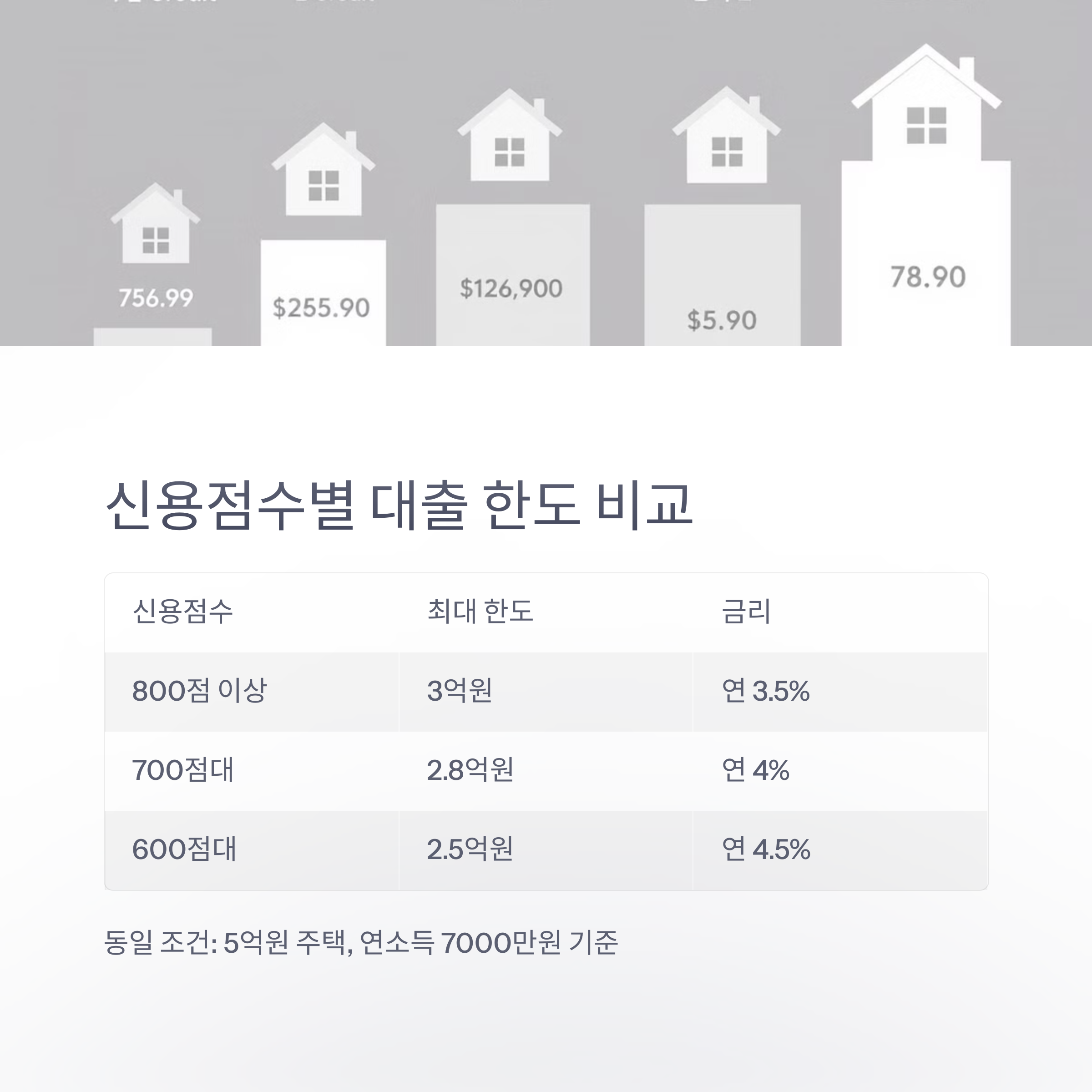 위 표에서 볼 수 있듯이, 신용점수는 주택담보대출의 전 과정에 걸쳐 중요한 영향을 미칩니다. 특히 주목할 점은 신용점수가 낮을수록 LTV(담보인정비율)가 제한될 수 있다는 것입니다.