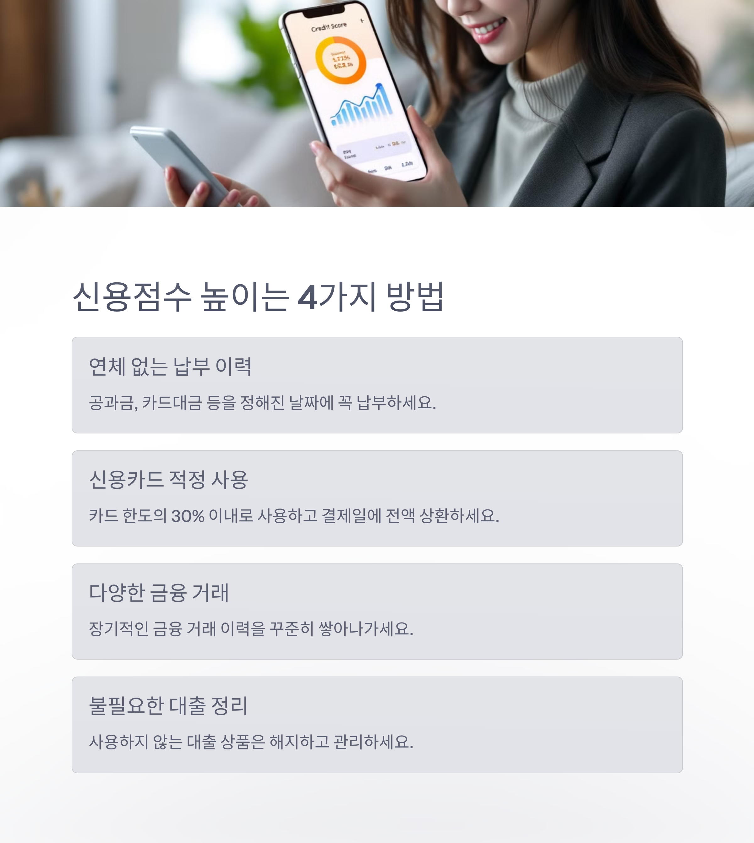 | 신용점수 개선 | 대출 한도 증가, 금리 인하 | 6개월~1년 | 꾸준한 관리 필요, 단기간 급상승 어려움 |