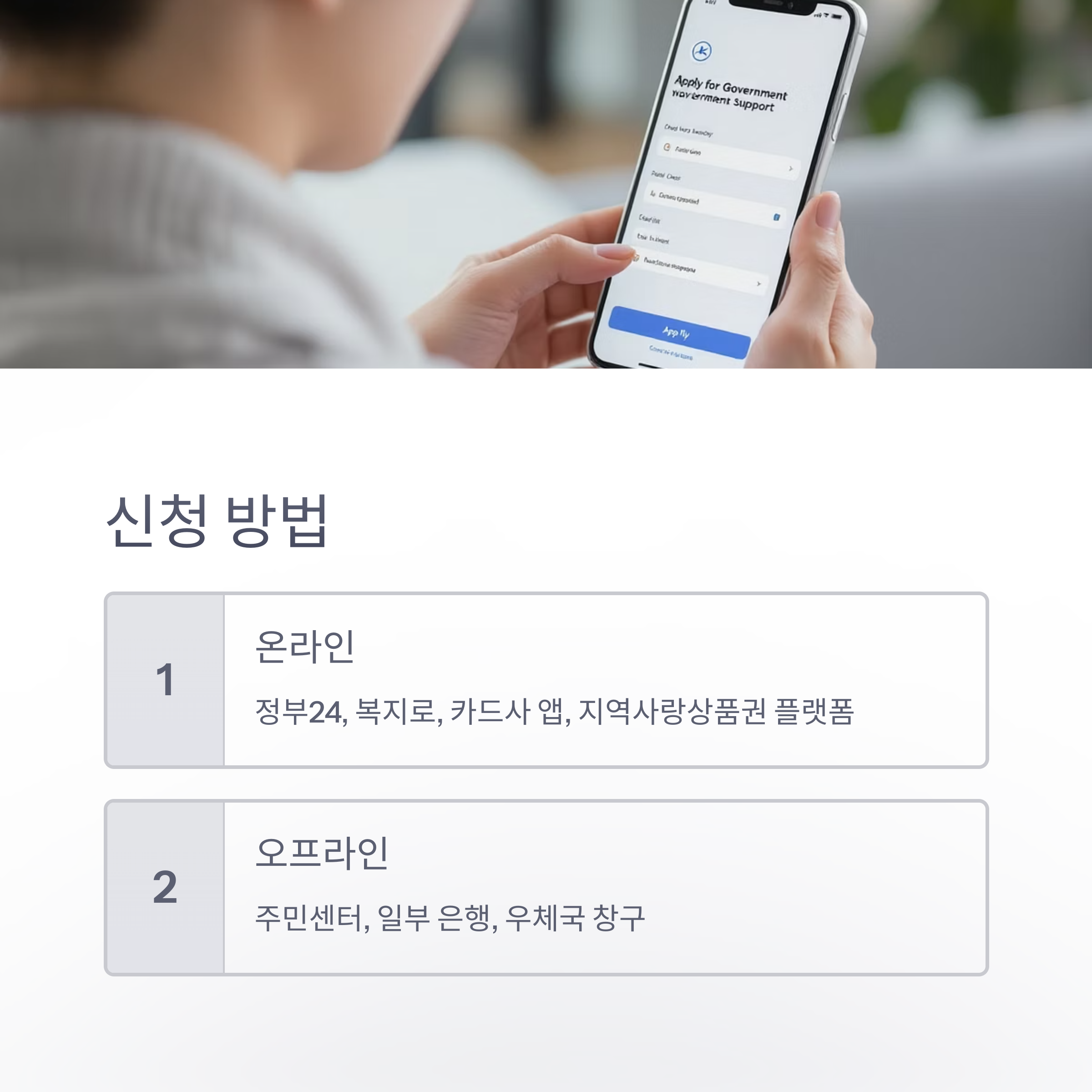 - 온라인: 정부24, 복지로, 카드사 앱, 지역사랑상품권 플랫폼