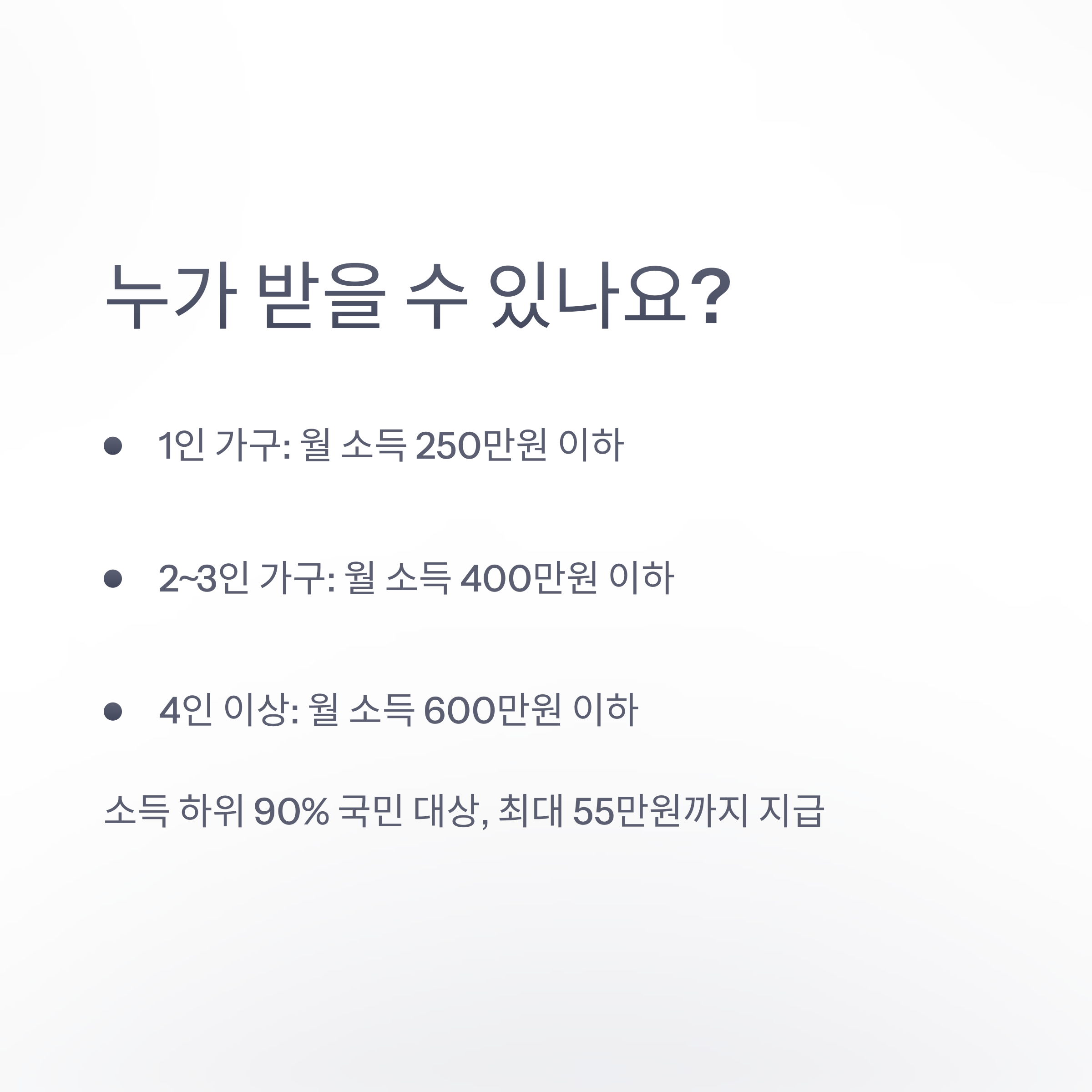 - 1인 가구: 월 소득 250만 원 이하 - 2~3인 가구: 월 소득 400만 원 이하