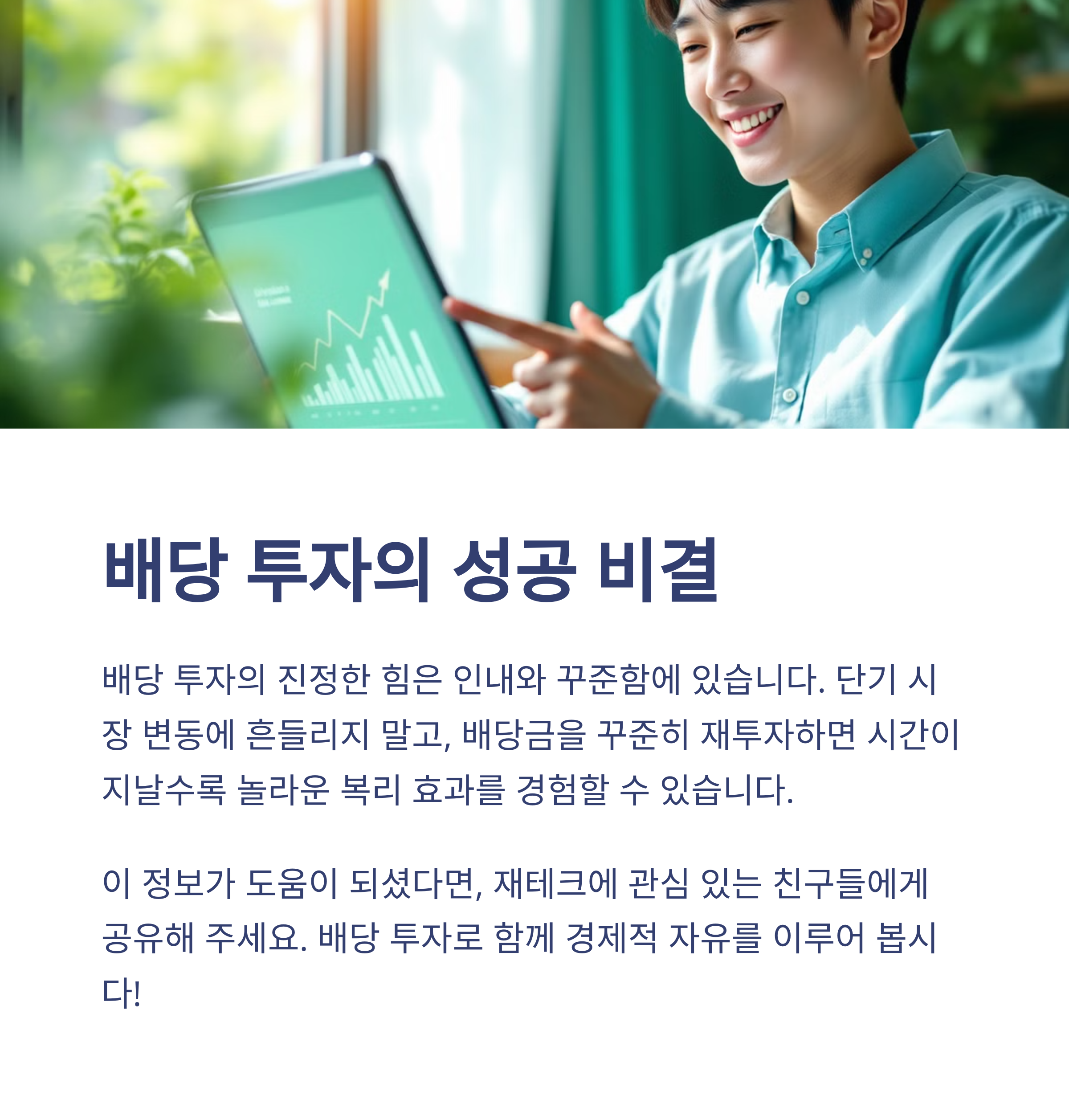 여러분도 오늘부터 배당주 투자를 시작하여, 미래의 안정적인 현금흐름을 만들어보는 것은 어떨까요? 작은 시작이 모여 큰 결실을 맺는 배당 투자의 여정에 함께하시길 바랍니다.