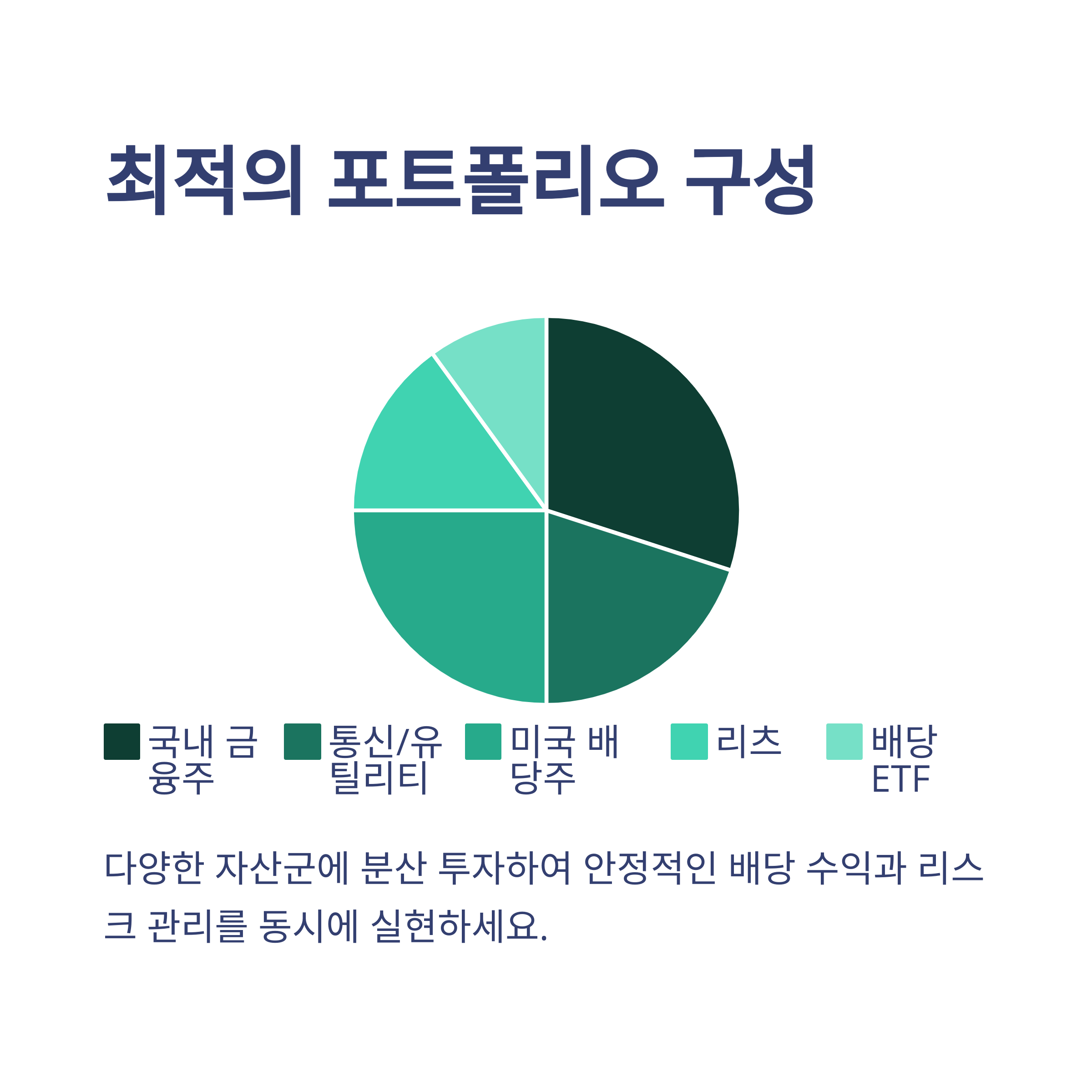 월 100만원 배당금 포트폴리오를 구성할 때 가장 중요한 것은 '분산'입니다. 산업별, 지역별, 배당 지급 시기별로 적절히 분산하여 리스크를 줄이고 현금흐름을 안정화해야 합니다.