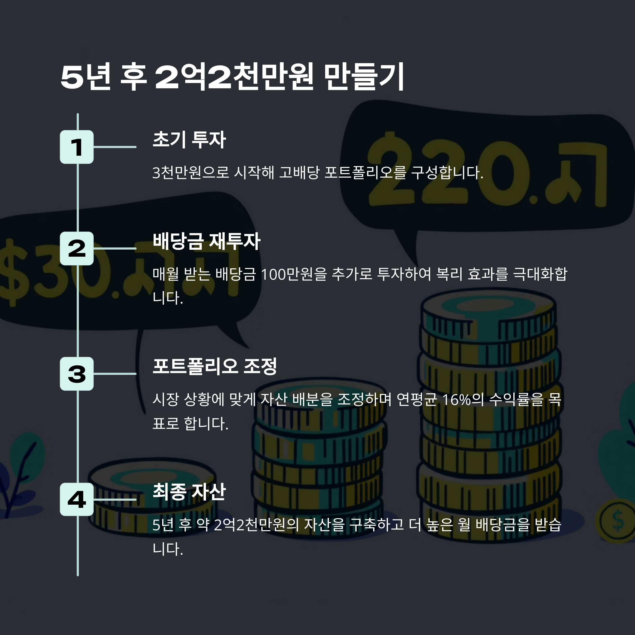 | 5년차 | 2억 2천만원 | 100만원 | 5.5% | 월별 배당금 평준화 전략 |